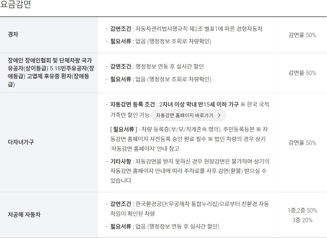 장애인, 국가유공자, 다자녀 가구 등은 50% 요금 할인 및 감면 혜택을 받을 수 있습니다. 필요 서류가 있는 항목도 있으니 잘 준비해서 할인받으시면 됩니다.