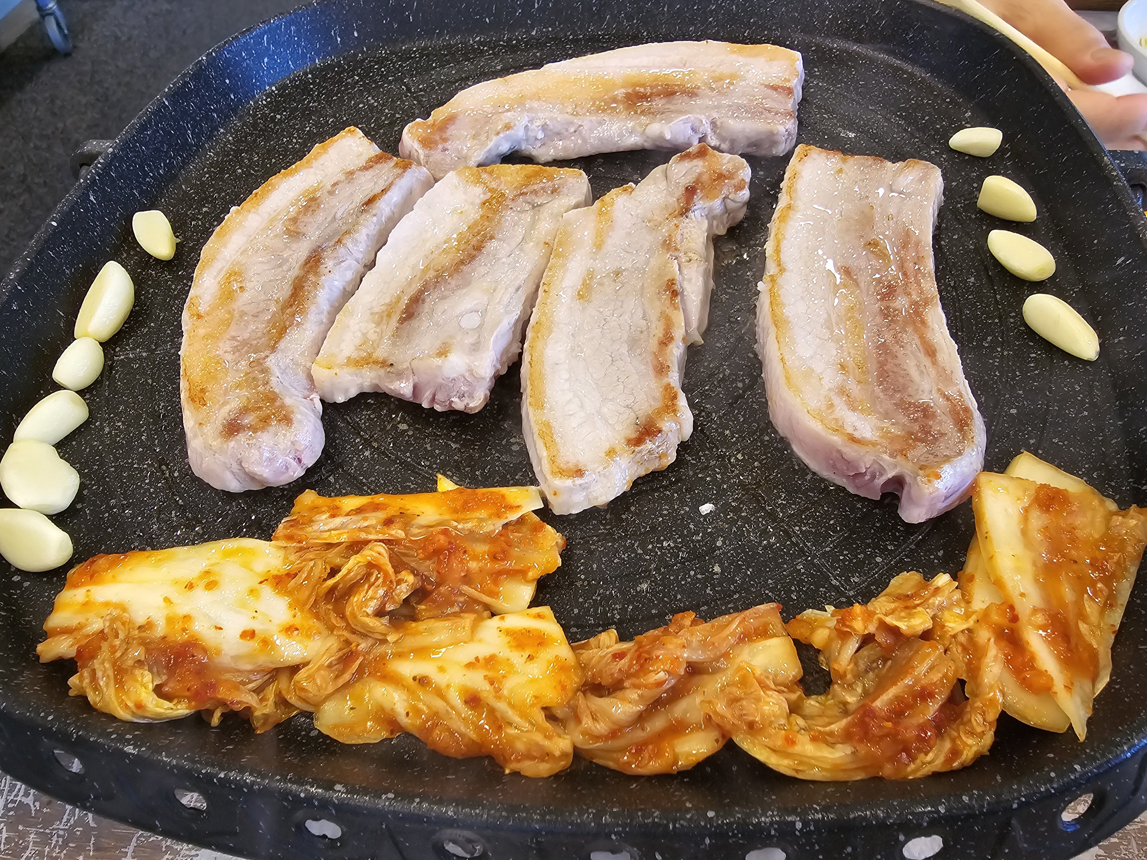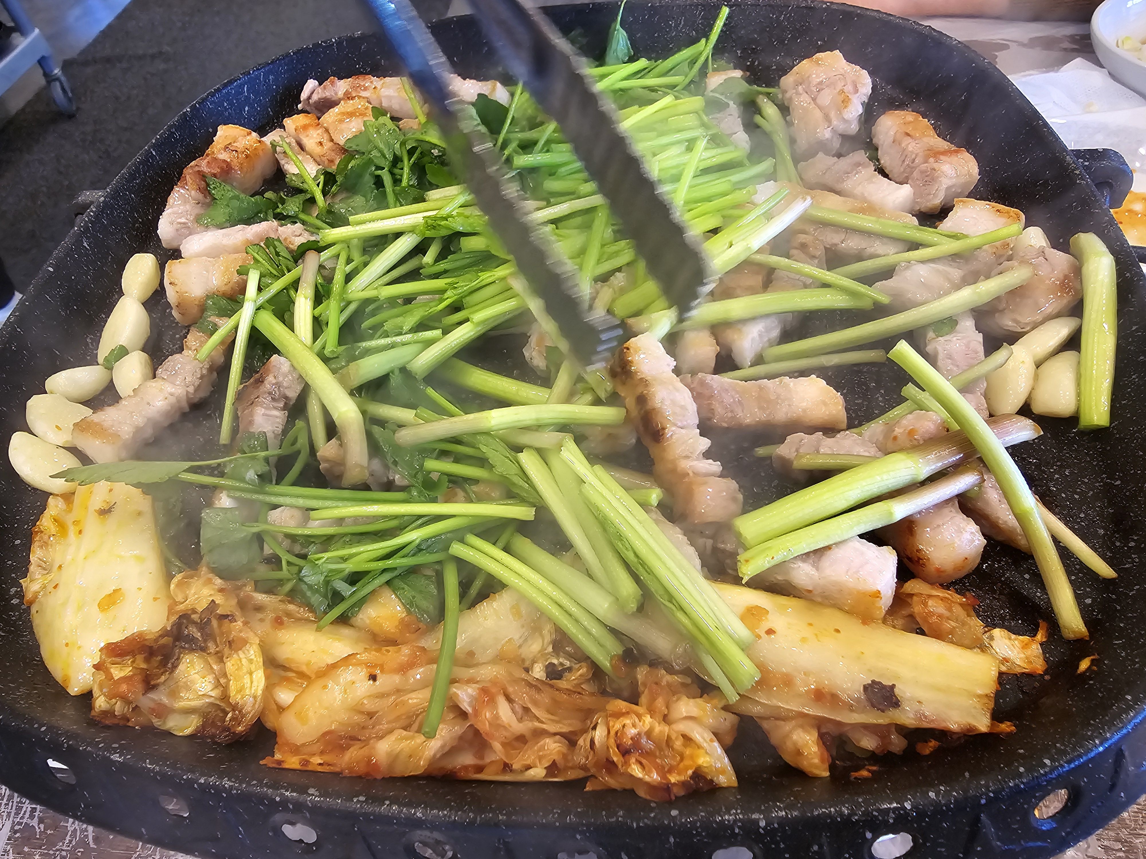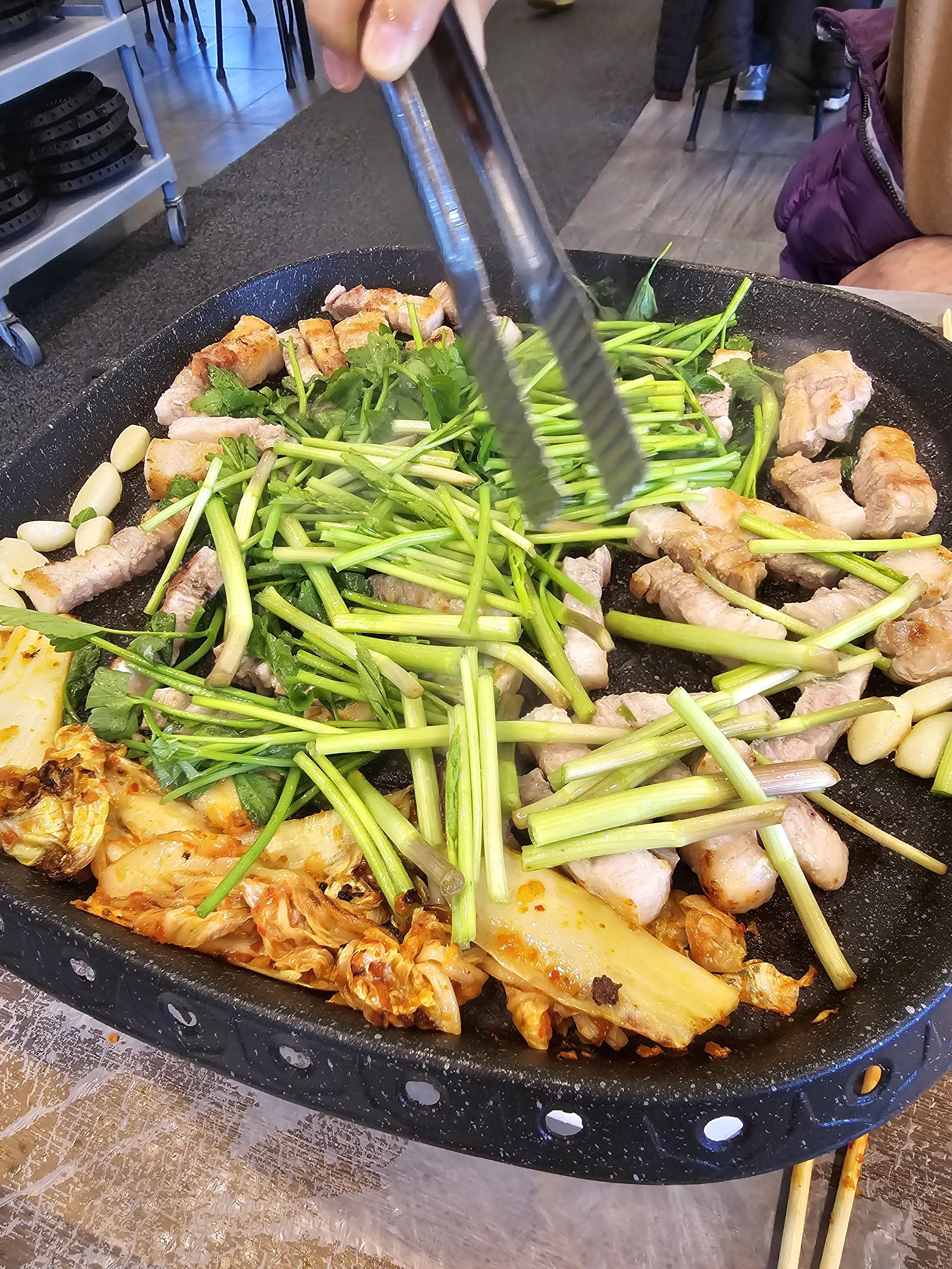 삼겹살3인분+미나리 한 접시+ 미나리 비빔밥+ 사이다= 2명에서 배부르게 먹었습니다.