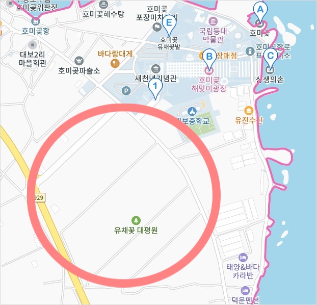 • 유채꽃밭 위치: '동그라미'표시 되어있는 유채꽃 대평원과, "E"라고 표시되어 있는 작은 유채꽃밭이 있습니다.